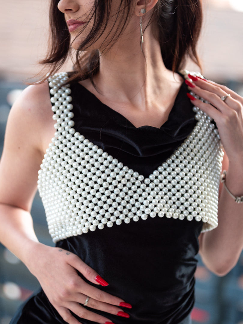 ✨ Top decorativ realizat manual, lucrat din perle acrilice, ușoare și rezistente. Designul conturat subțiază elegant talia și oferă un efect vizual modern și delicat.